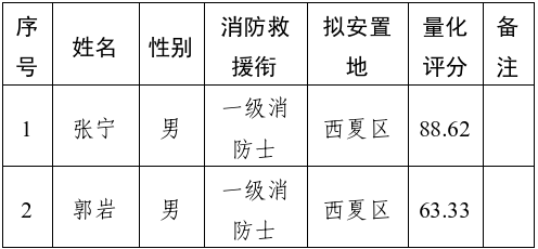 为切实做好西夏区2025年12月符合安置条件退出消防员安置工作,根据《国家综合性消防救援队伍退出消防员安置办法(试行)》《宁夏回族自治区退出消防员安置实施办法》(宁应急〔2024〕79号)《关于做好国家综合性消防救援队伍2025年12月退出消防员安置工作的通知》(宁应急〔2026〕11号)等文件要求,现将西夏区2025年12月退出消防员转岗量化评分及排序结果予以公示:
