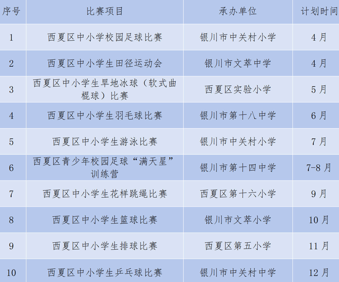 为深入贯彻“健康第一”教育理念,全面提升青少年体质健康水平,近日,银川市西夏区教育局印发《2026年银川市西夏区中小学生体育竞赛计划》,2026年,西夏区教育局将举办10项中小学生体育赛事,涵盖足球、跳绳、田径等多个运动领域,赛程从4月持续至12月,具体安排如下: