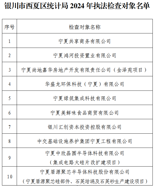 附件:银川市西夏区统计局2024年执法检查对象名单