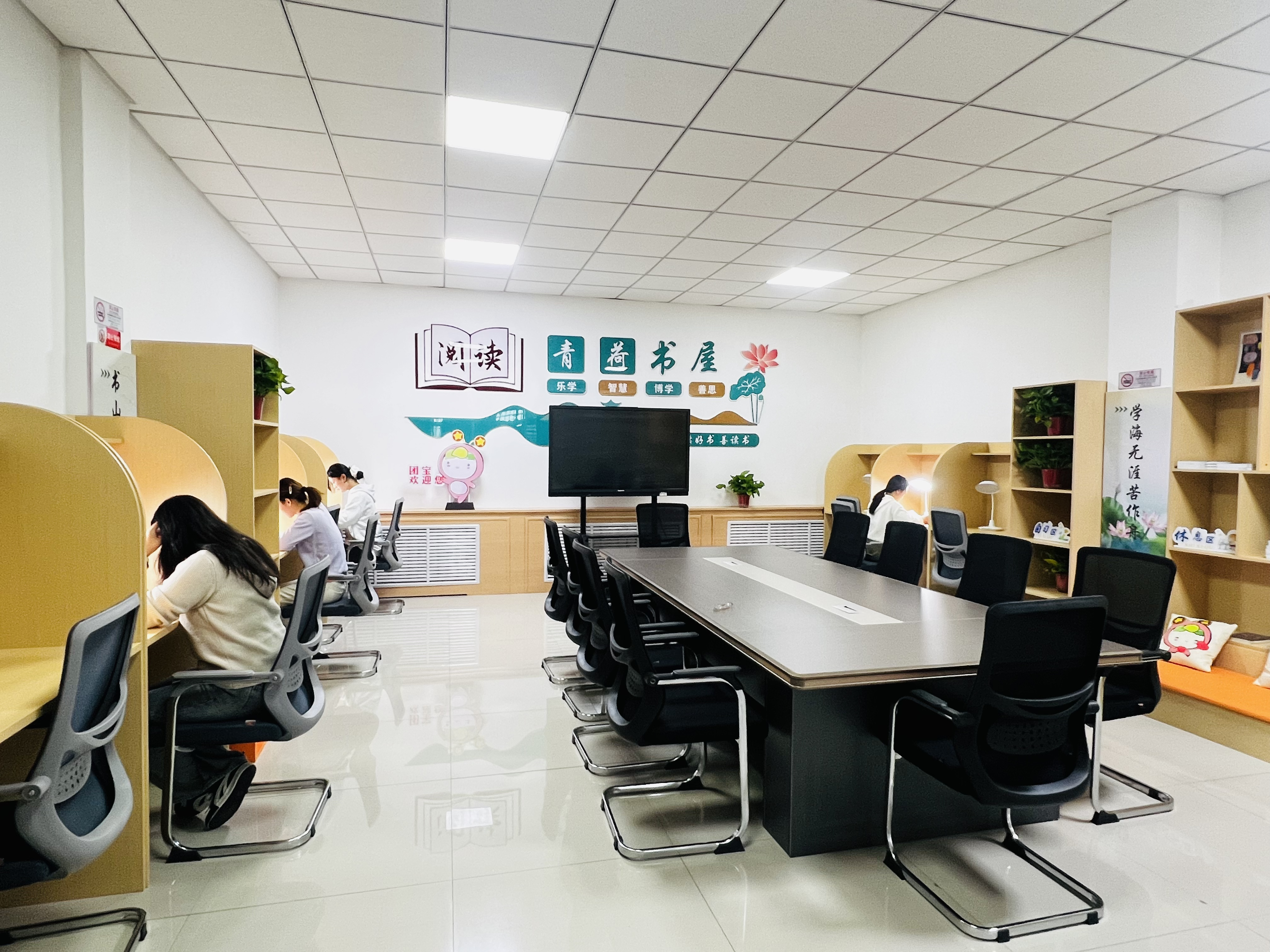 走进青荷书屋,隔断式自习桌整齐排列,每个座位都配备护眼台灯、充电插座;屋内免费无线网络全覆盖,自助饮水机、微波炉等便民设施一应俱全。书屋特别划分“静心自习区”“共享阅读区”与“文化活动区”,满足学习者沉浸独学、小组交流、社群活动等多样化需求。