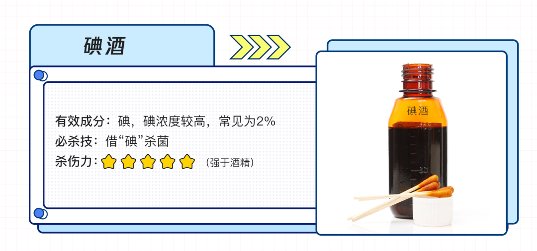 碘酒——消毒界的“超强星二代”,集碘的超强消毒能力和酒精的刺激性于一身。