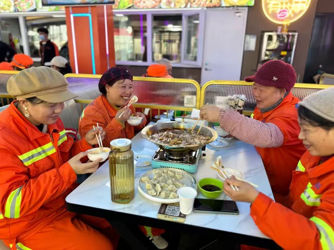 结束上午清扫工作的环卫工人们陆续走进店里,不少人的双手冻得通红,刚一落座,服务员便立刻递上一碗热饺子。从事环卫工作8年的王师傅接过饺子,咬下一口瞬间眉眼弯弯:“这饺子比我家包的还香!以前冬至大多是在路边买个包子对付,今天能和几十个工友一起热热闹闹吃饺子,感觉跟过年似的。”
