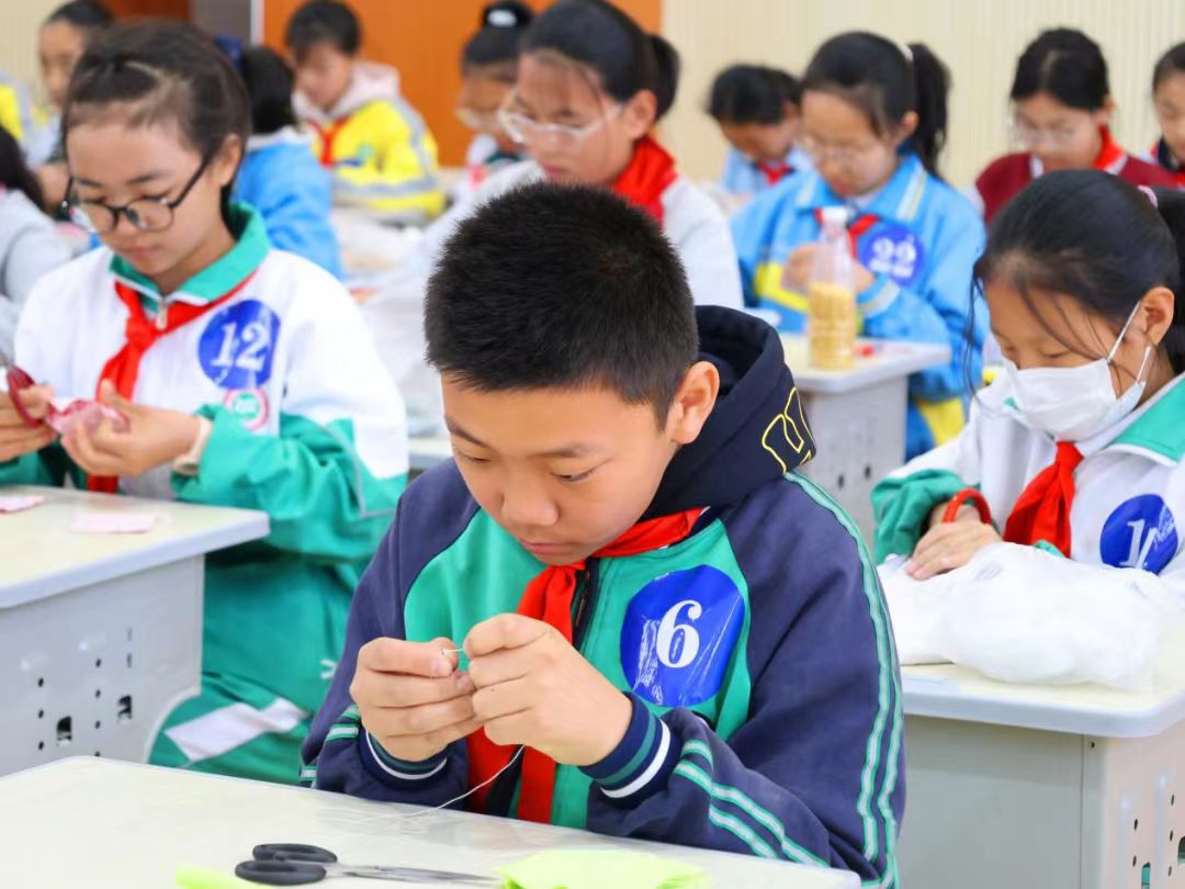 活动现场,缝沙包与传统工艺制作两个项目同步展开。在缝沙包区域,同学们穿针引线、裁剪拼合,动作娴熟沉稳,每个环节都考验着同学们的耐心与细致;在传统工艺制作区域,孩子们运用剪纸、编织、泥塑等传统技艺,把对生活的热爱、对美好的向往,化作一件件风格多元、意蕴丰富的作品,在非遗传承中锤炼耐心与专注力。