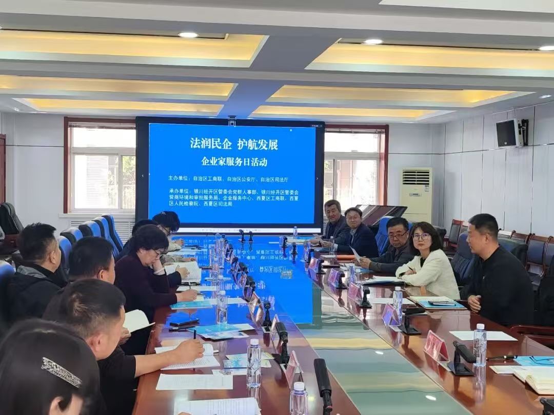 4月21日全国企业家活动日当天,由西夏区工商业联合会联合银川经济技术开发区管委会相关部门、西夏区人民检察院、西夏区司法局等单位共同承办的“法润民企・护航发展”企业家服务日活动在银川经开区举行,20余家中小微企业、“专精特新”企业代表及相关部门负责人齐聚现场,共话法治护航之道,共谋高质量发展良策。