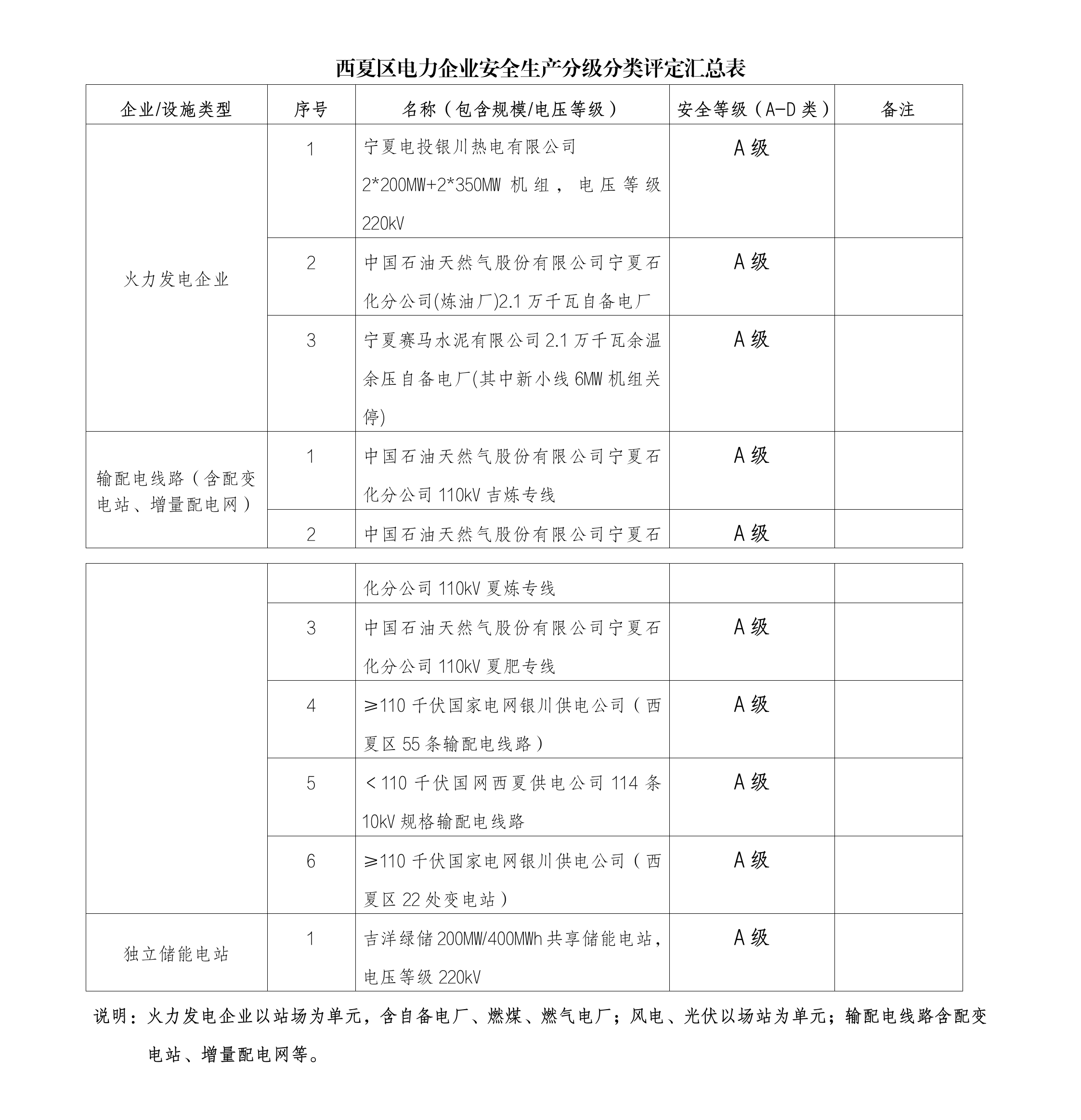 附件:西夏区电力企业安全生产分级分类评定汇总表