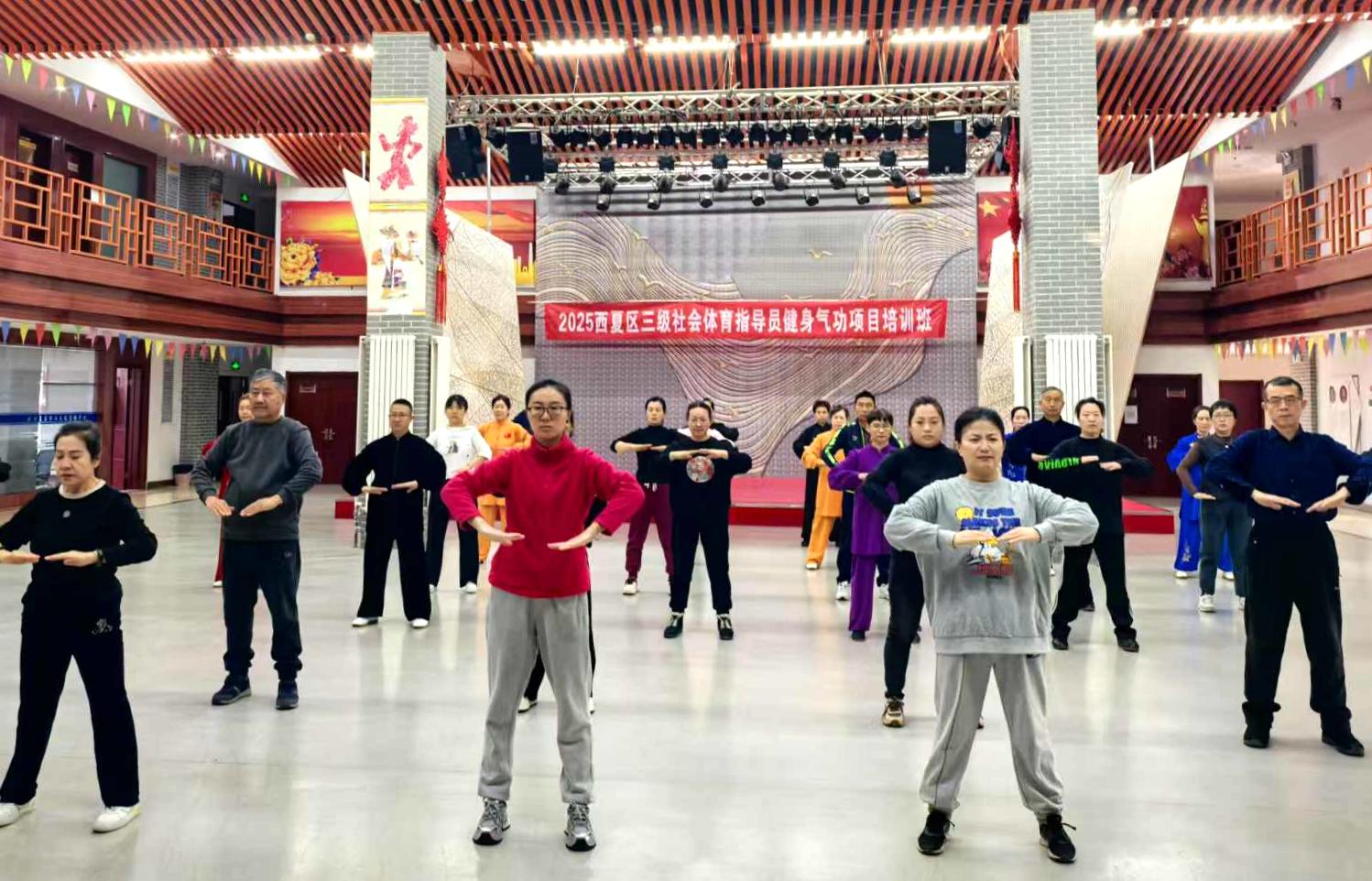 本次活动由西夏区文化旅游体育广电局主办,西夏区社会体育指导员协会承办,邀请专业教练授课。“五禽戏,由汉末名医华佗创编,模仿虎、鹿、熊、猿、鸟五种动物的动作和姿态进行肢体活动,旨在增强体质、防治疾病。五禽戏不仅是健身功法,更是一种‘运动处方’,适合不同年龄和身体状况的人群,能够有效缓解压力和焦虑,提高工作效率和生活质量。”培训中,教练详细讲解五禽戏的历史渊源和功法理论,还一招一式地示范,学员们全身心投入其中,享受五禽戏对身心健康带来的益处和乐趣。