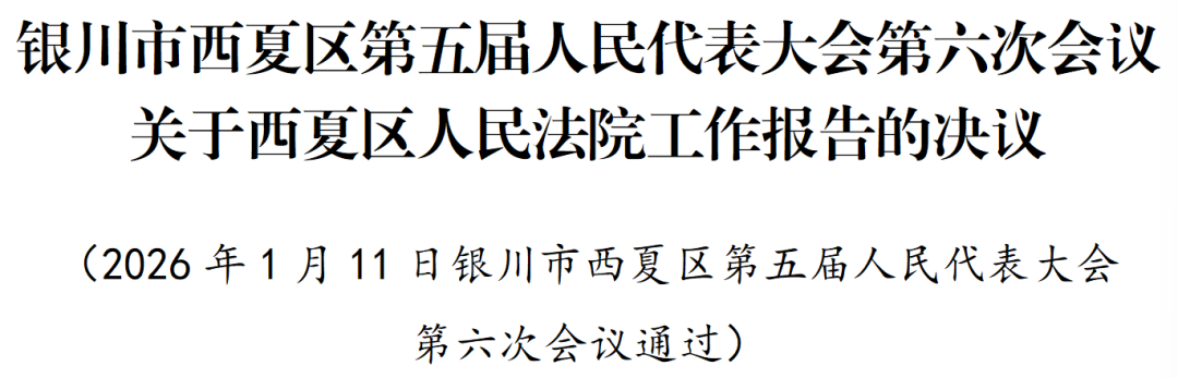 银川市西夏区第五届人民代表大会第六次会议听取和审议了辛建国同志所作的区人民法院工作报告。会议充分肯定了区人民法院2025年的工作,同意报告提出的2026年工作思路,决定批准这个报告。