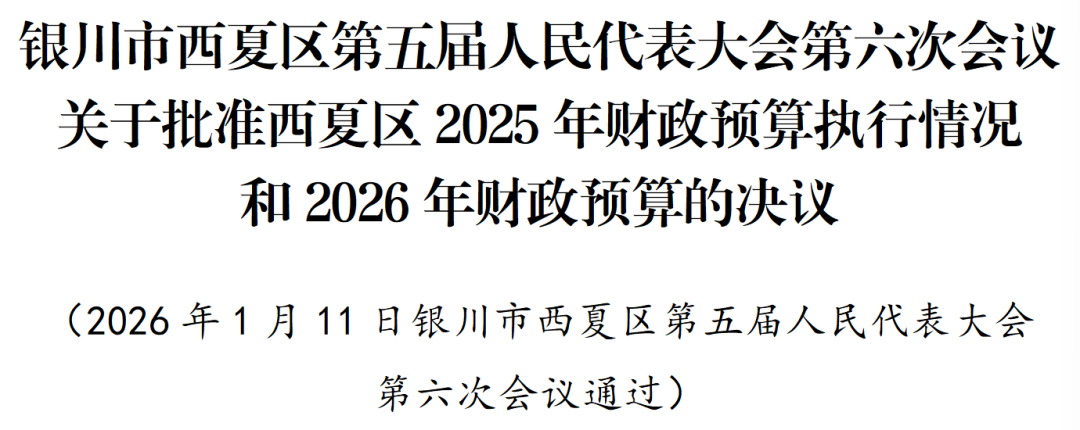 银川市西夏区第五届人民代表大会第六次会议审查了区人民政府提出的《关于西夏区2025年财政预算执行情况和2026年财政预算草案的报告》及西夏区2026年财政预算草案,同意区人大财政经济委员会的审查结果报告。会议决定,批准《关于西夏区2025年财政预算执行情况和2026年财政预算草案的报告》,批准西夏区2026年财政预算。