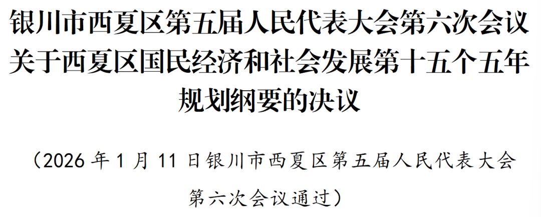 银川市西夏区第五届人民代表大会第六次会议审查了区人民政府提出的《西夏区国民经济和社会发展第十五个五年规划纲要草案》。会议同意区人大财政经济委员会的审查结果报告,决定批准这个规划纲要。