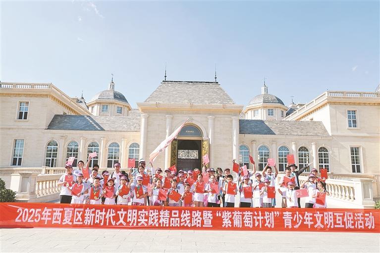 “这枚木活字上的西夏文字,藏着古人的智慧。”西夏陵国家考古遗址公园内,讲解员的话音刚落,孩子们便迫不及待地动手拓印,这是“紫葡萄计划”青少年研学活动的热闹场景。作为西夏区“文明实践+文旅融合”三大品牌之一,该计划以7岁至15岁青少年为核心,通过“沉浸式研学+互动式体验”模式,搭建起“走进文明、践行文明、传承文明”的生动课堂。贺兰山岩画遗址区里,孩子们辨认太阳神、狩猎图等岩画,体验拓片制作;漫葡·看见贺兰沉浸式演艺小镇里,皮影戏传承人手把手教学,孩子们合作演绎经典片段……200余名青少年在“看、听、学、做”中触摸文脉,从文化学习者变身传承者,形成了可复制推广的青少年文明实践典型案例。