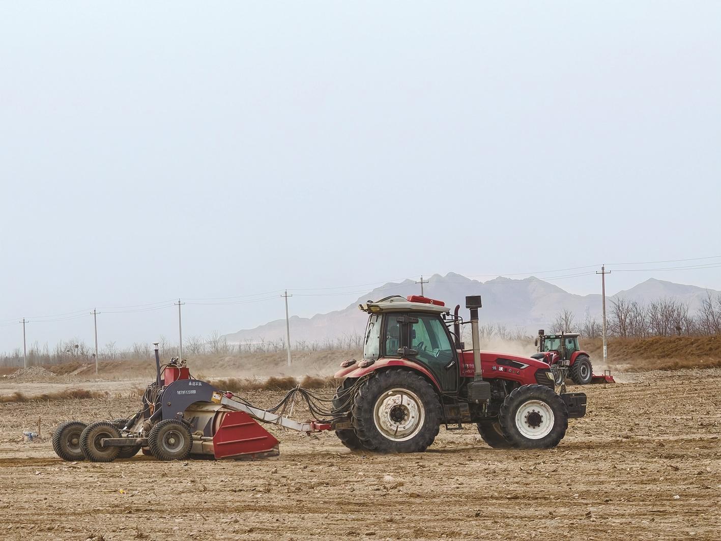 在5号治理区,两台旋耕机轰鸣作业,工人们捡拾田间石块,同步开展土地平整、施肥改良工作,为农户春播生产扫清障碍。