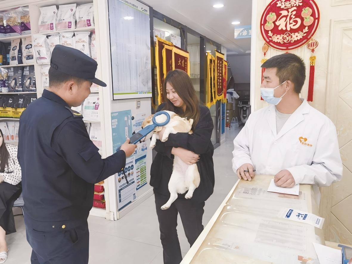 西夏区综合执法局工作人员查验犬证(4月13日摄)。 本报记者 李阳阳 摄