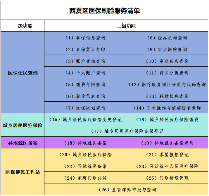 目前,该医保业务综合服务终端应用设备内设缴费二维码,并加载了四大功能板块,内含26项医保业务功能(详见附表)。广大居民无须带证带卡,可直接前往各镇街便民服务中心、村(社区)等地,只需通过刷脸完成认证身份,进入页面后,选择自己需要办理的医保经办业务即可。