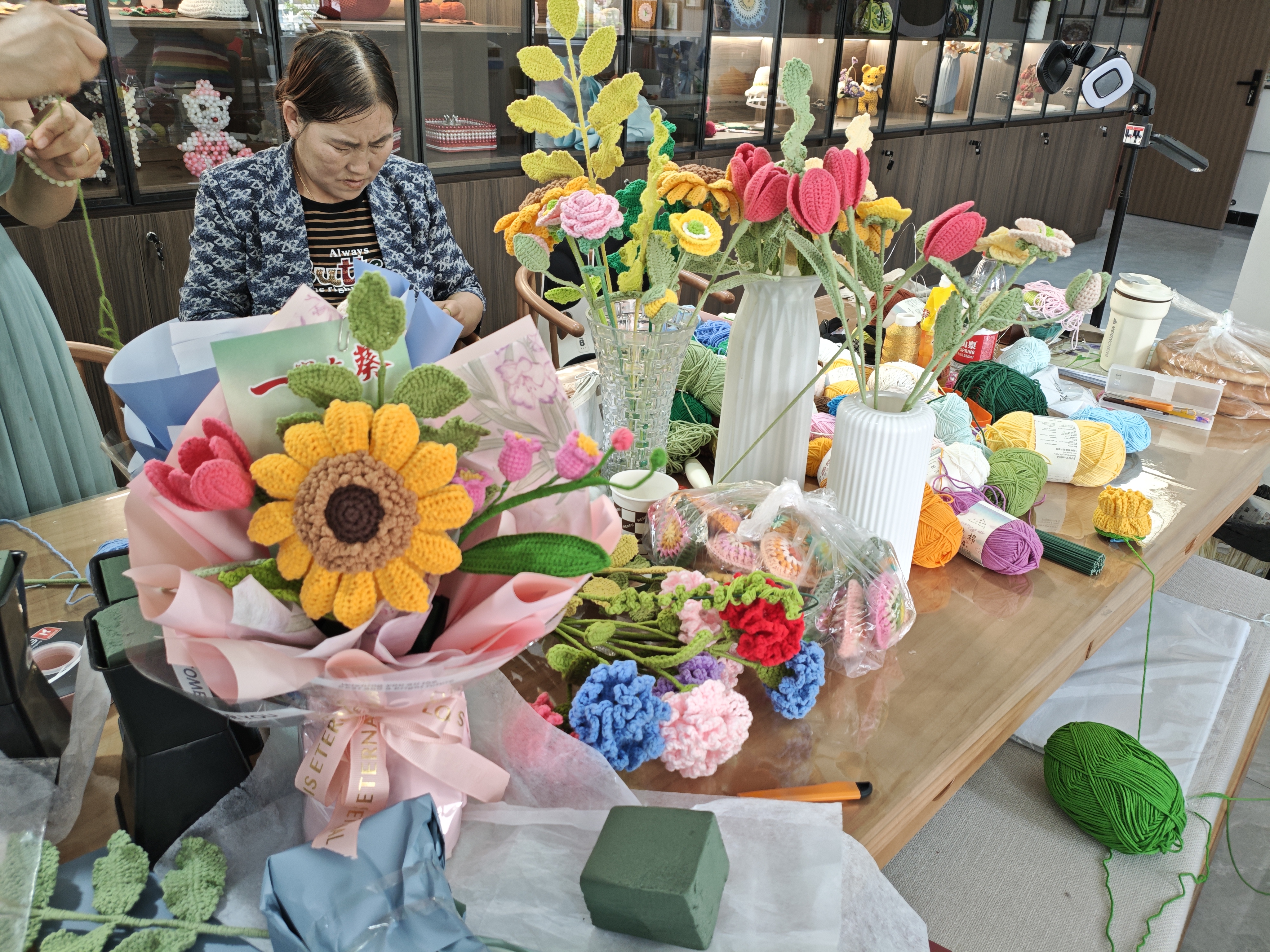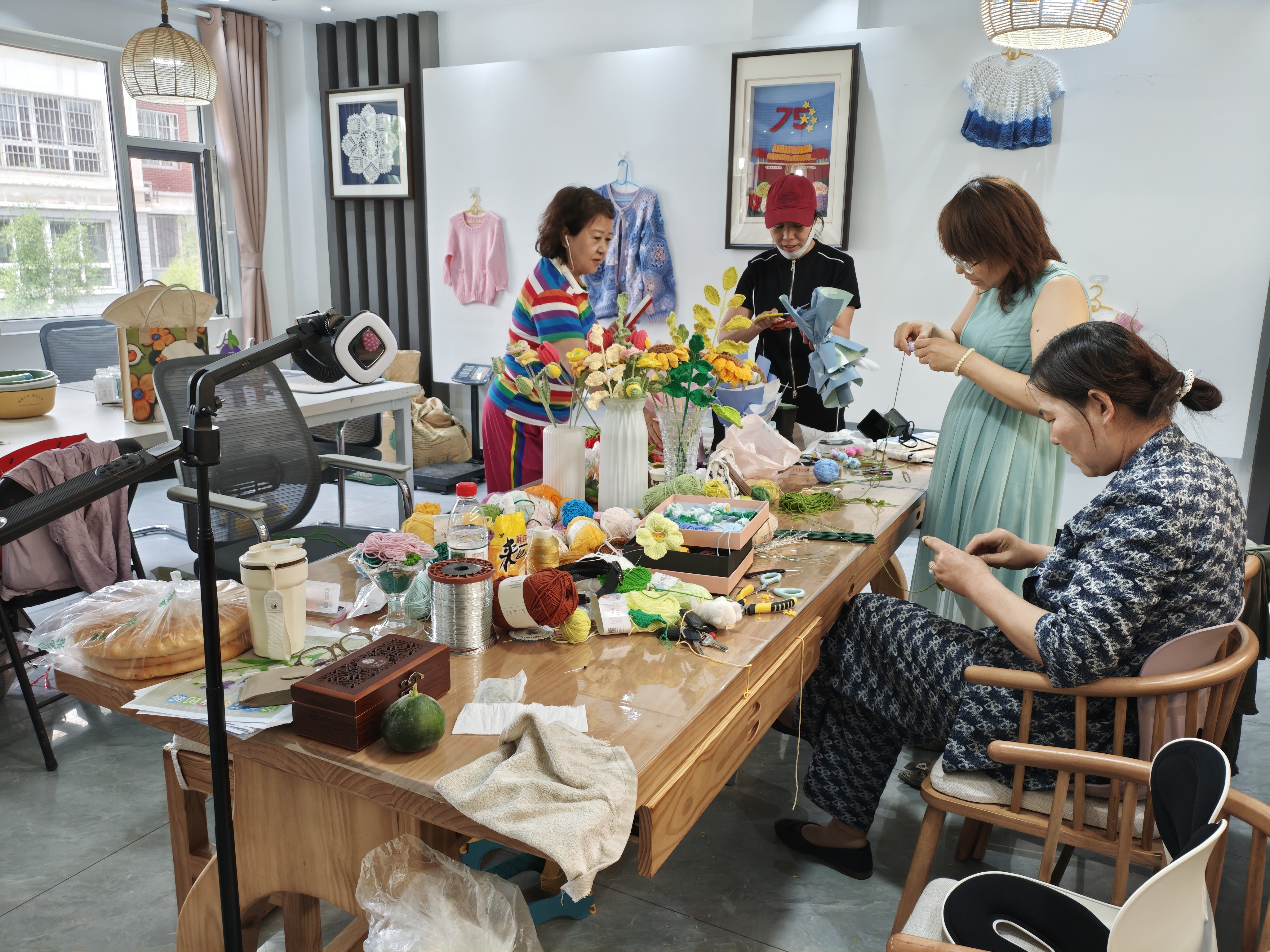 西夏区宁华路街道农垦建社区“惠新”手工钩织车间内气氛热烈,数十名织女围坐在一起切磋钩织技法,交流心得。