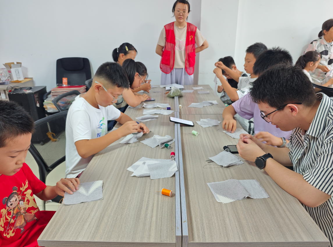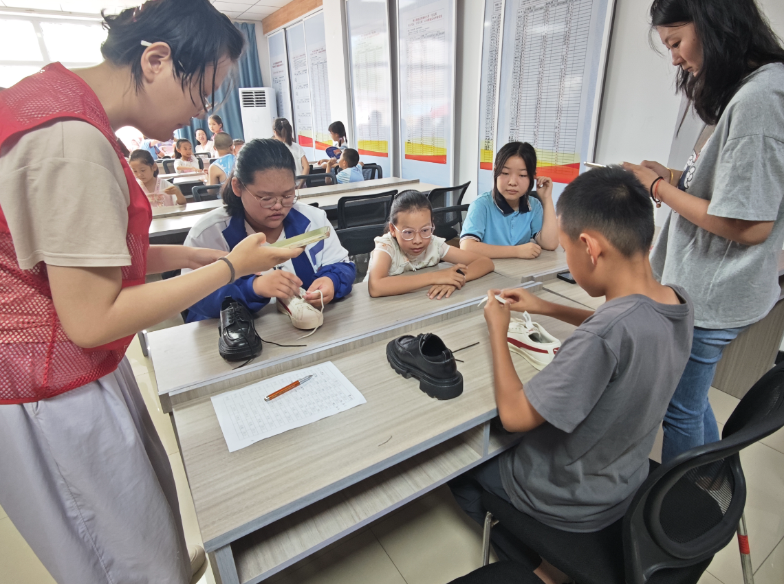 进阶组(10岁-15岁)的挑战难度直线飙升。缝沙包区域,小“裁缝”们眼神专注,针尖在布料间灵巧游走,细密针脚稳稳包裹填充物,一个个棱角分明的沙包逐渐成型;快速系鞋带则如“指尖速度与激情”,解带、穿插、拉紧一气呵成,比的就是谁更快更牢。