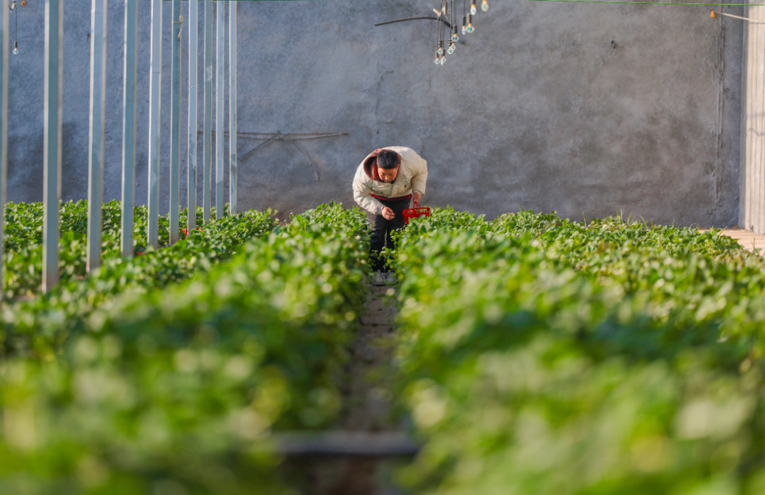 这片热闹的采摘区,属于泾华村设施温棚产业园区。园区位于文祥村文祥街与观平路交叉口东侧,占地120亩。2019年到2020年,村党支部筹集资金,建起37座日光拱棚和6座四季暖棚。棚里主要种萝卜、芹菜、草莓等果蔬。2024年,村里又把集体所属的28座温棚改造升级成日光温室。这些棚,一年产值能有300万元。