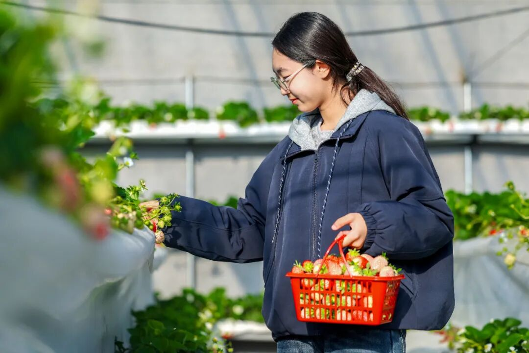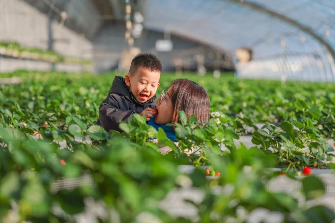 市民在草莓园体验采摘的乐趣。