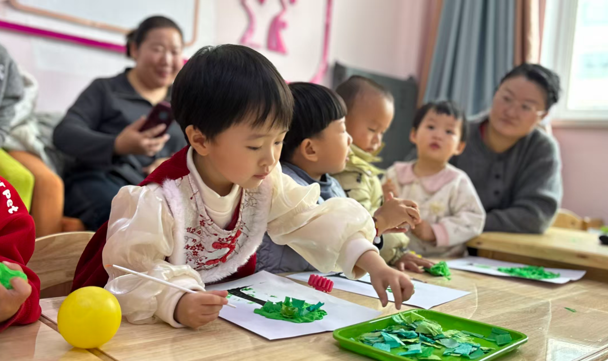 当天,“宝宝屋”还开展了“春日童趣·共绘美好”主题艺术创作活动,16名幼儿发挥他们的想象力,用魔法粘土、绿色纸片等制作出一棵棵生机盎然的“春日大树”。“这样的亲子活动特别有意义,孩子玩得开心,还锻炼了动手能力,希望社区以后多多举办。”参与活动的王华说道。