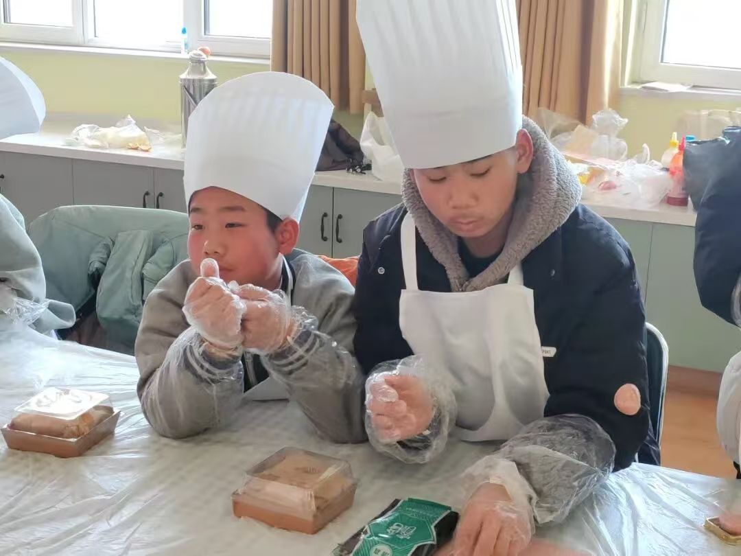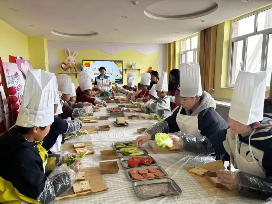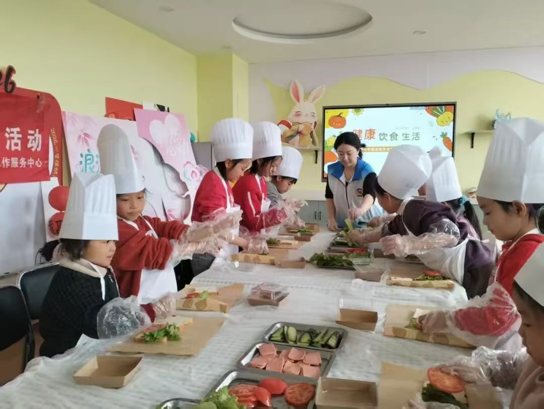 厨艺实操环节是本次活动的亮点,孩子们在工作人员的指导下,依次开展三明治和中式糕点制作。从食材清洗、搭配,到动手涂抹酱料、揉面塑形,孩子们个个兴致盎然,认真完成每一个步骤。工作人员在实操中同步讲解每种食材的营养价值,提醒孩子们注意操作安全和食材节约,鼓励大家发挥创意制作专属美食。孩子们不仅体验到了动手制作的乐趣,更理解了“荤素搭配、营养均衡”的饮食原则。