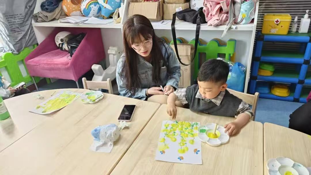 “现在我们来当小画家,给油菜花画个家吧!”进入卡纸创作环节,孩子们化身“小小艺术家”,有的用黄色蜡笔在卡纸上画满圆点当花瓣,有的用绿色水彩笔勾出弯弯曲曲的花茎,还有的别出心裁地添上了蝴蝶、太阳等元素。“我的油菜花在跳舞!”“我的花田里有小兔子!”童言童语里满是天马行空的想象。老师穿梭其间,耐心指导家长如何引导孩子搭配色彩、规划画面,让艺术启蒙与亲子互动完美融合。