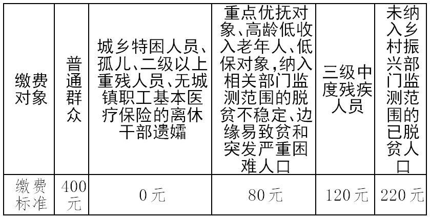 2025年度全区城乡居民基本医疗保险集中参保缴费期限为2024年9月25日至2024年12月31日。待遇享受期限为2025年1月1日至2025年12月31日。普通居民和各类医疗救助对象个人缴费标准见下表: